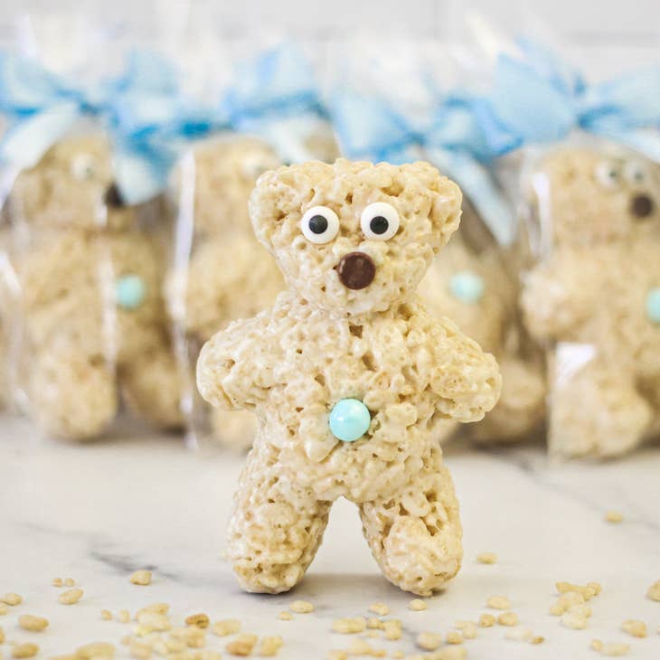 Description: Baby Bear Rice Crispie Treats come decorated with sugar eyes, a milk chocolate morsel nose and a chocolate coated candy belly button. Perfect for a birth announcement, baby shower or gift.