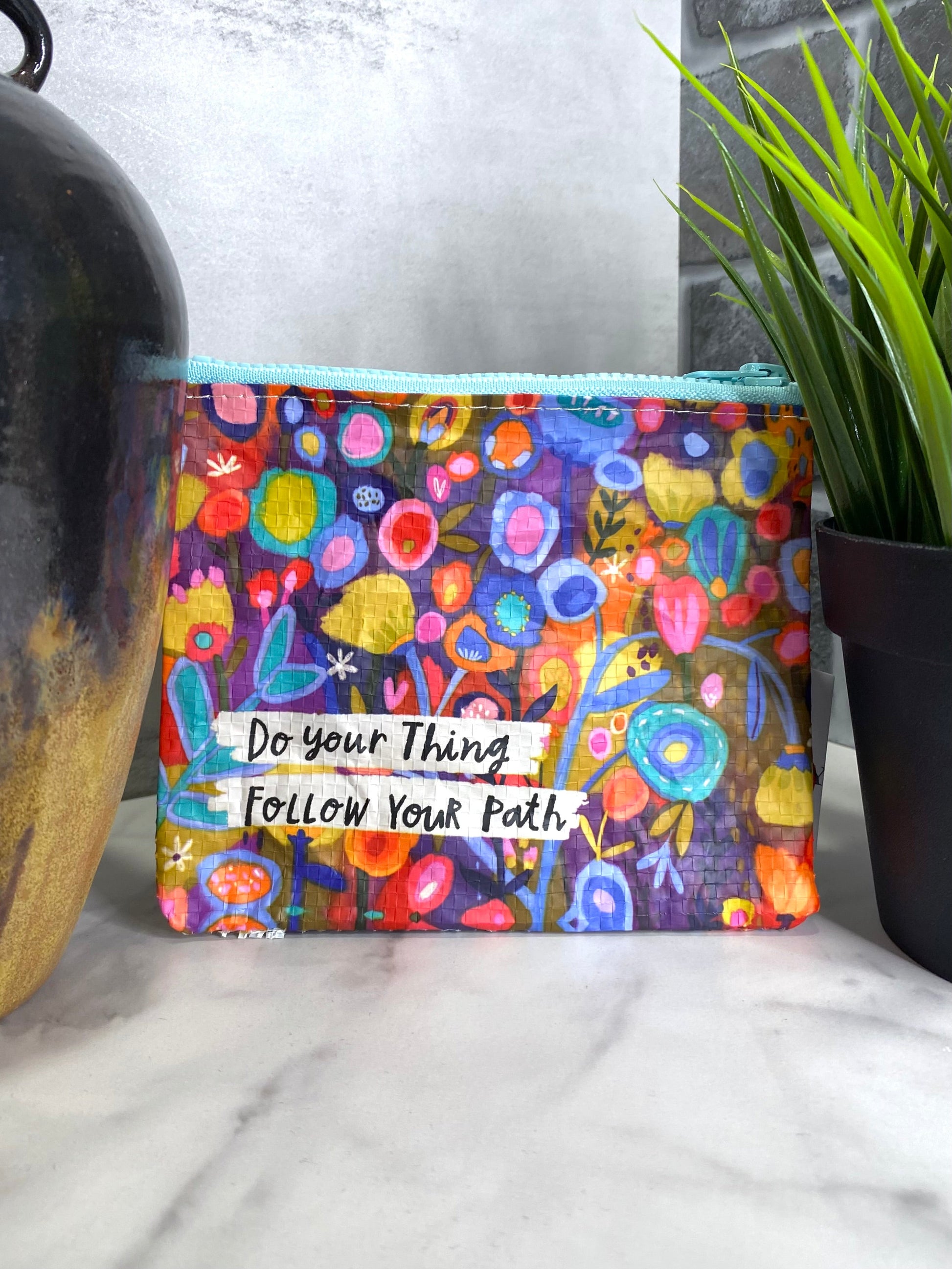 Made of post-consumer material, this double-sided zipper wallet features vibrant floral designs with "Do Your Thing Follow Your Path" sentiment. Contains a top zip closure.