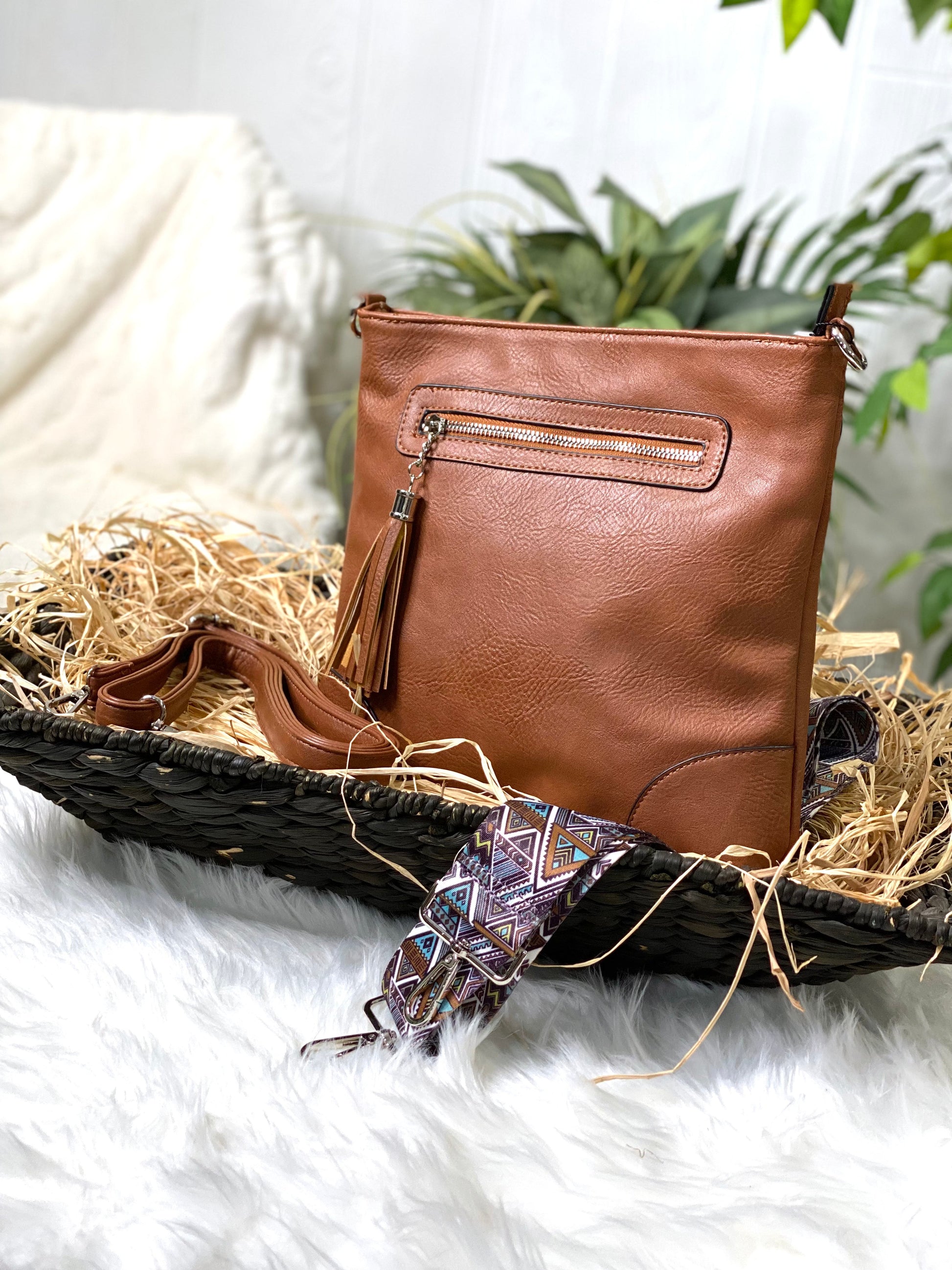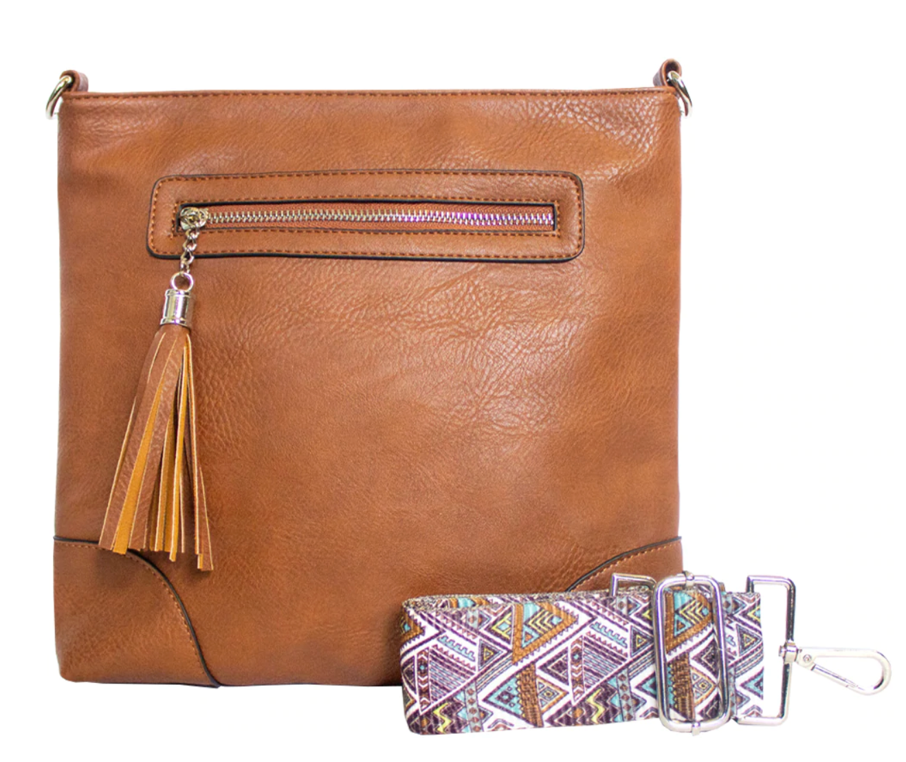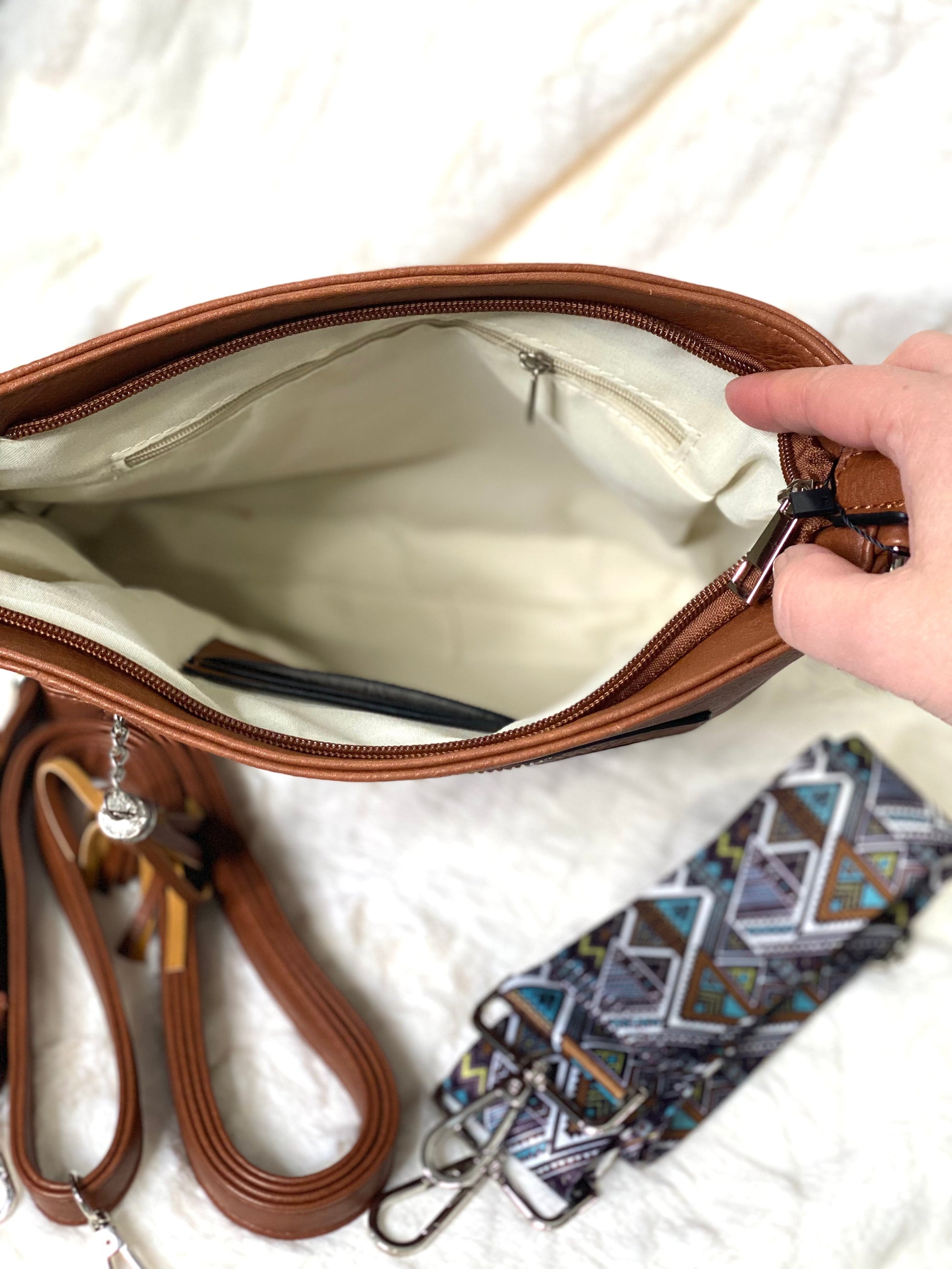 Great flat shape sits comfortably on your hip. Front zipper pocket for easy in and out. Comes with 2 strap options – a colorful guitar strap to add flare to every outfit and a solid vegan leather strap to match the handbag.