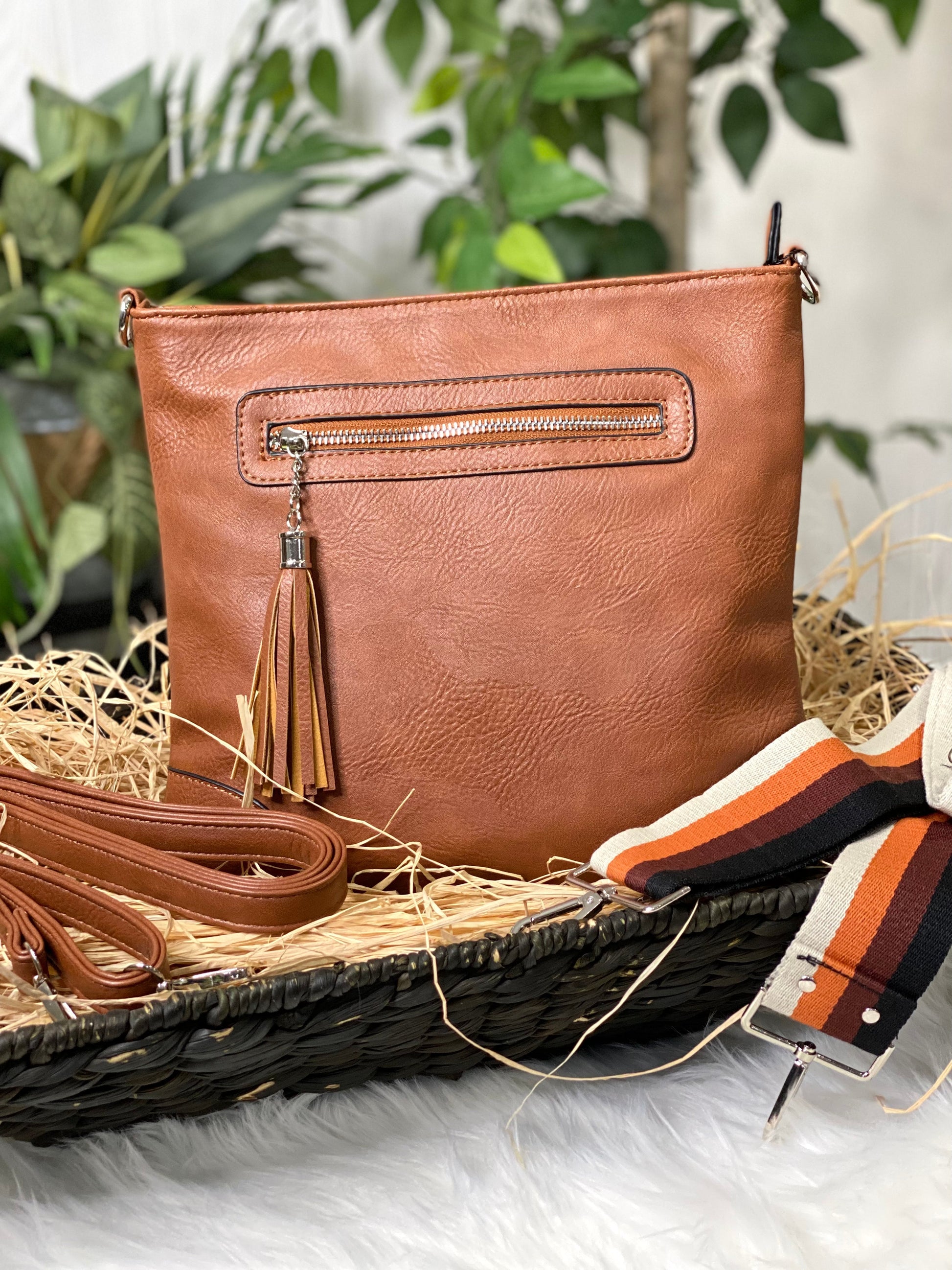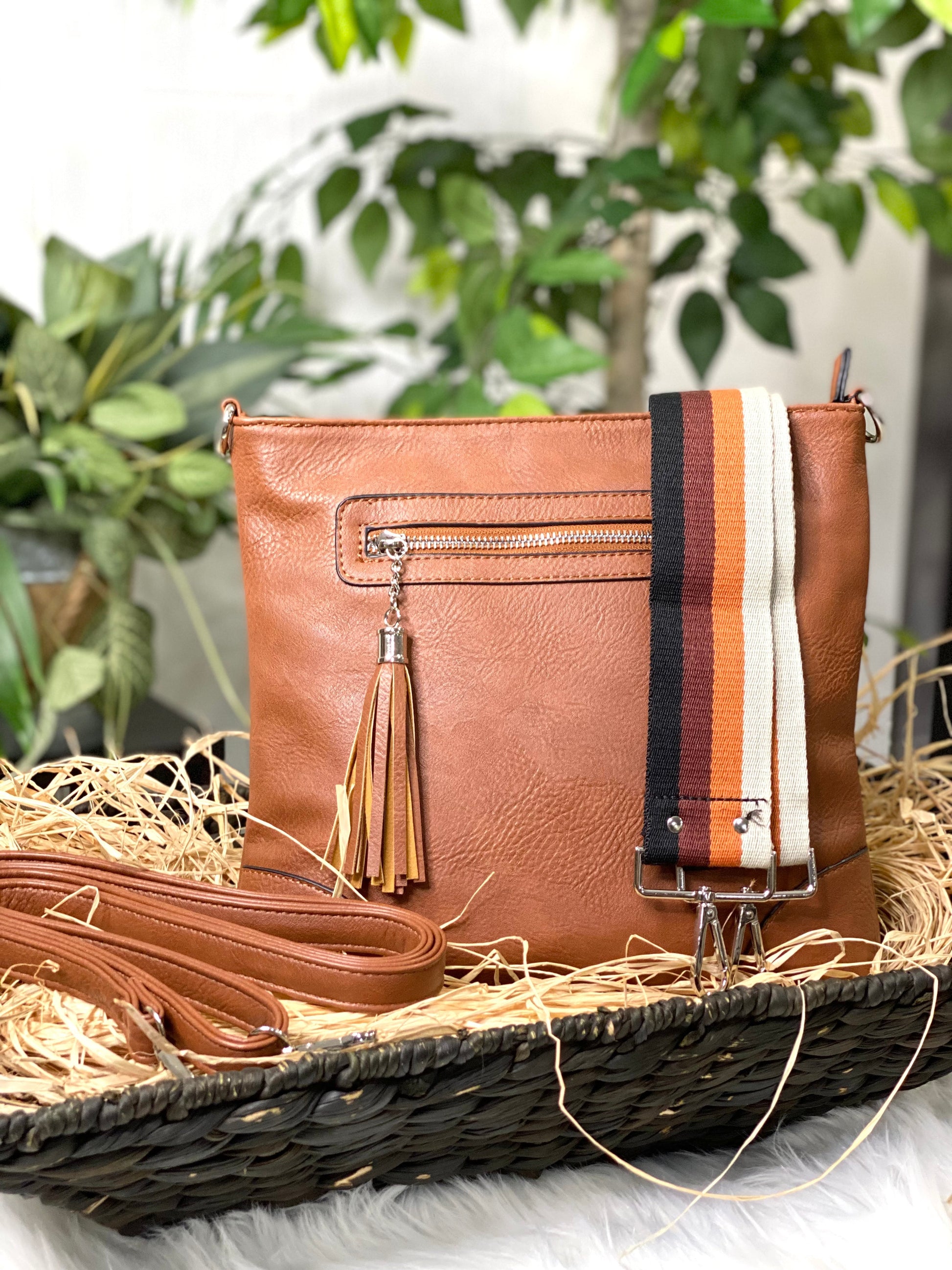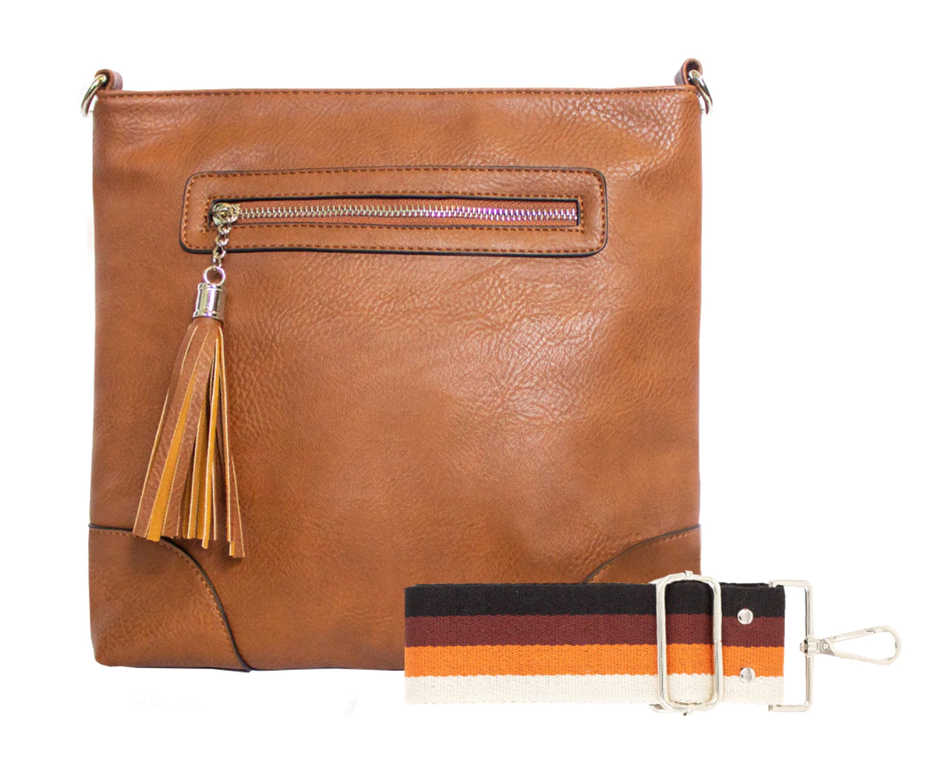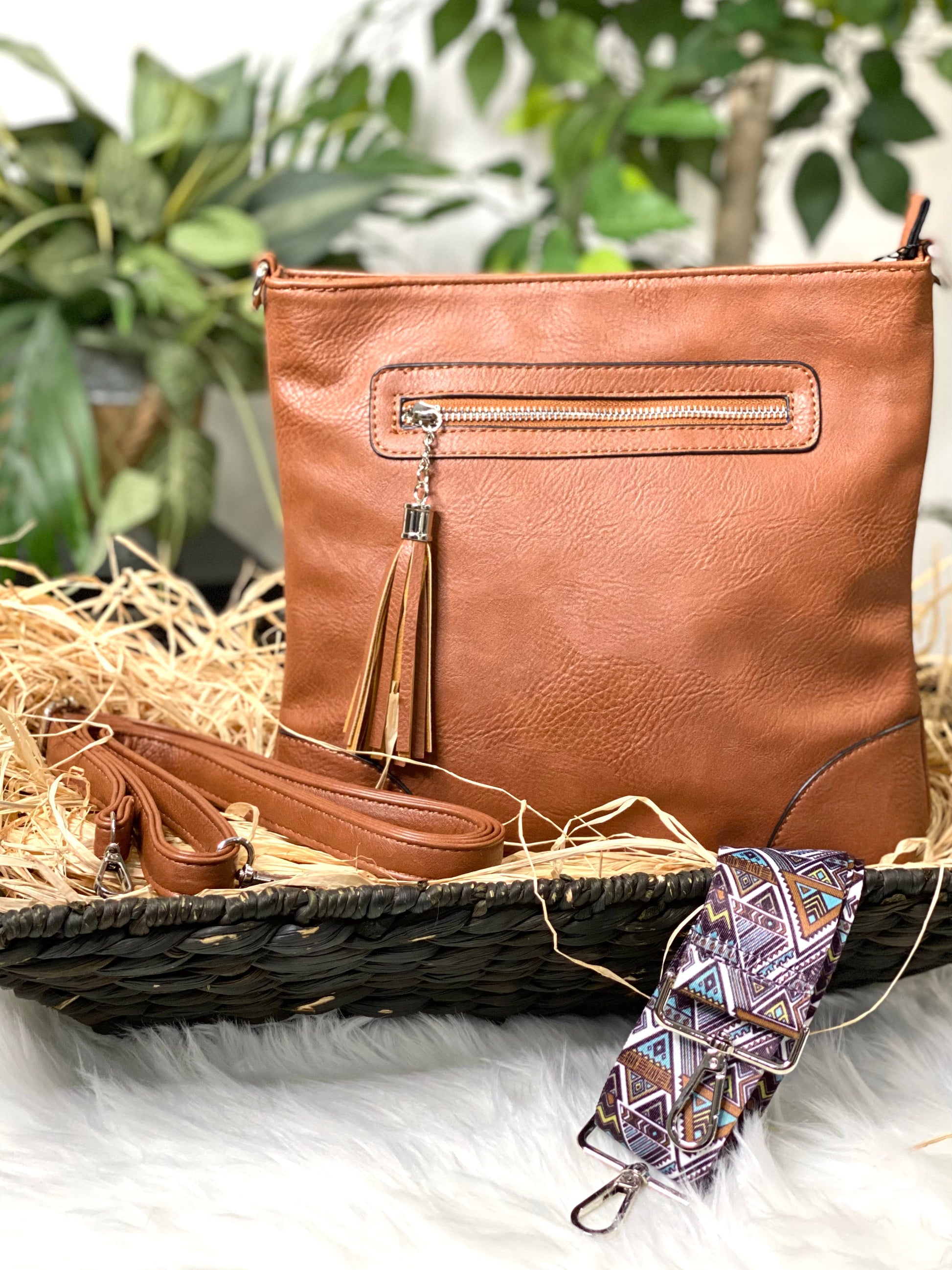 Great flat shape sits comfortably on your hip. Front zipper pocket for easy in and out. Comes with 2 strap options – a colorful guitar strap to add flare to every outfit and a solid vegan leather strap to match the handbag.