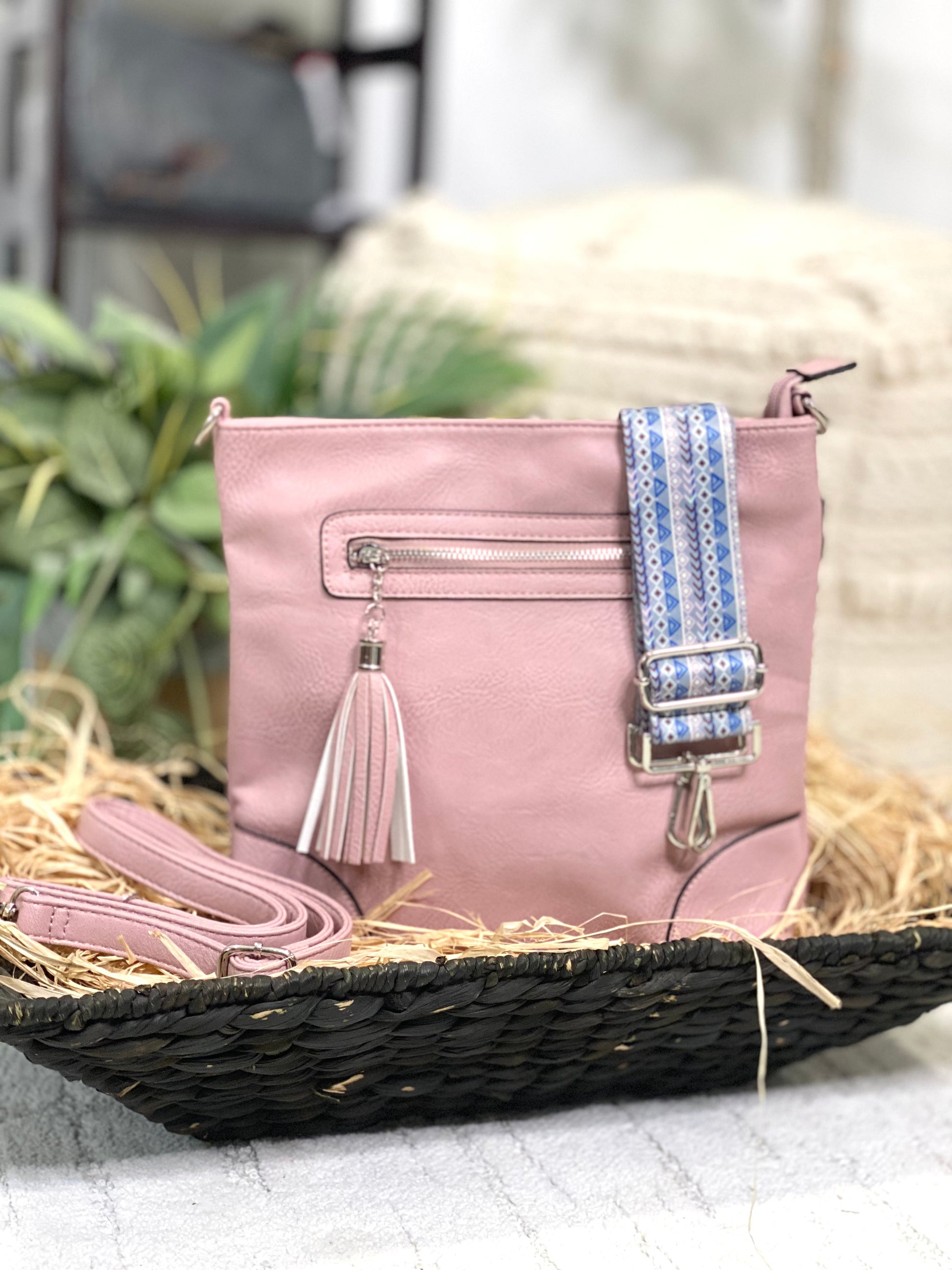 Great flat shape sits comfortably on your hip. Front zipper pocket for easy in and out. Comes with 2 strap options – a colorful guitar strap to add flare to every outfit and a solid vegan leather strap to match the handbag.