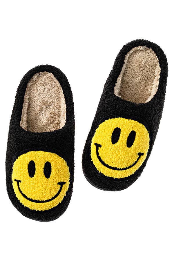 Smiley Face Slippers feature double hand-embroidered retro Smiley Face on curly Sherpa cotton, lightening up your everyday moments. Eco-friendly flush cotton & supportive rubber sole create that most-desired comfy feeling: warm, temperature-regulating, and moisture-wicking.