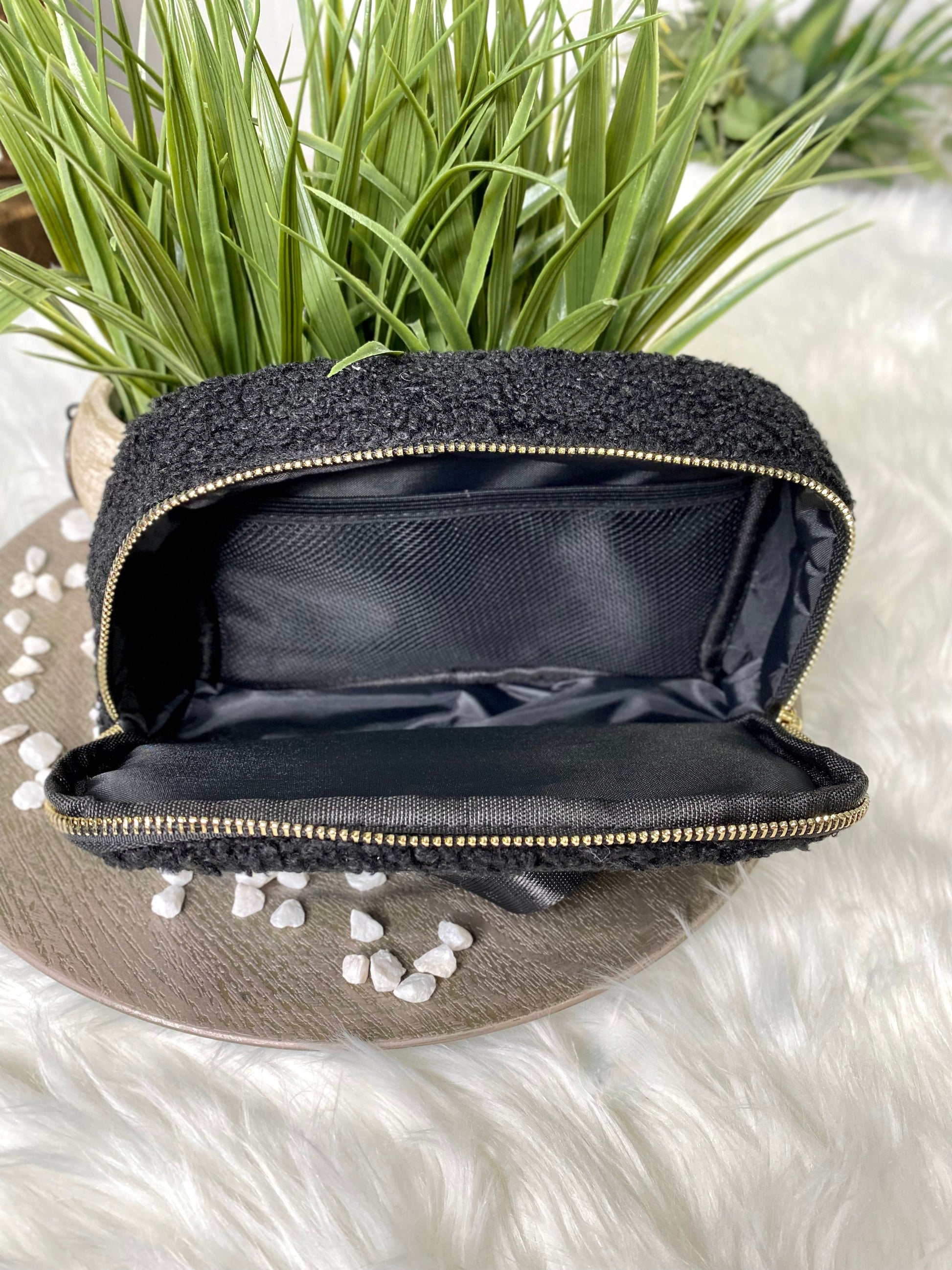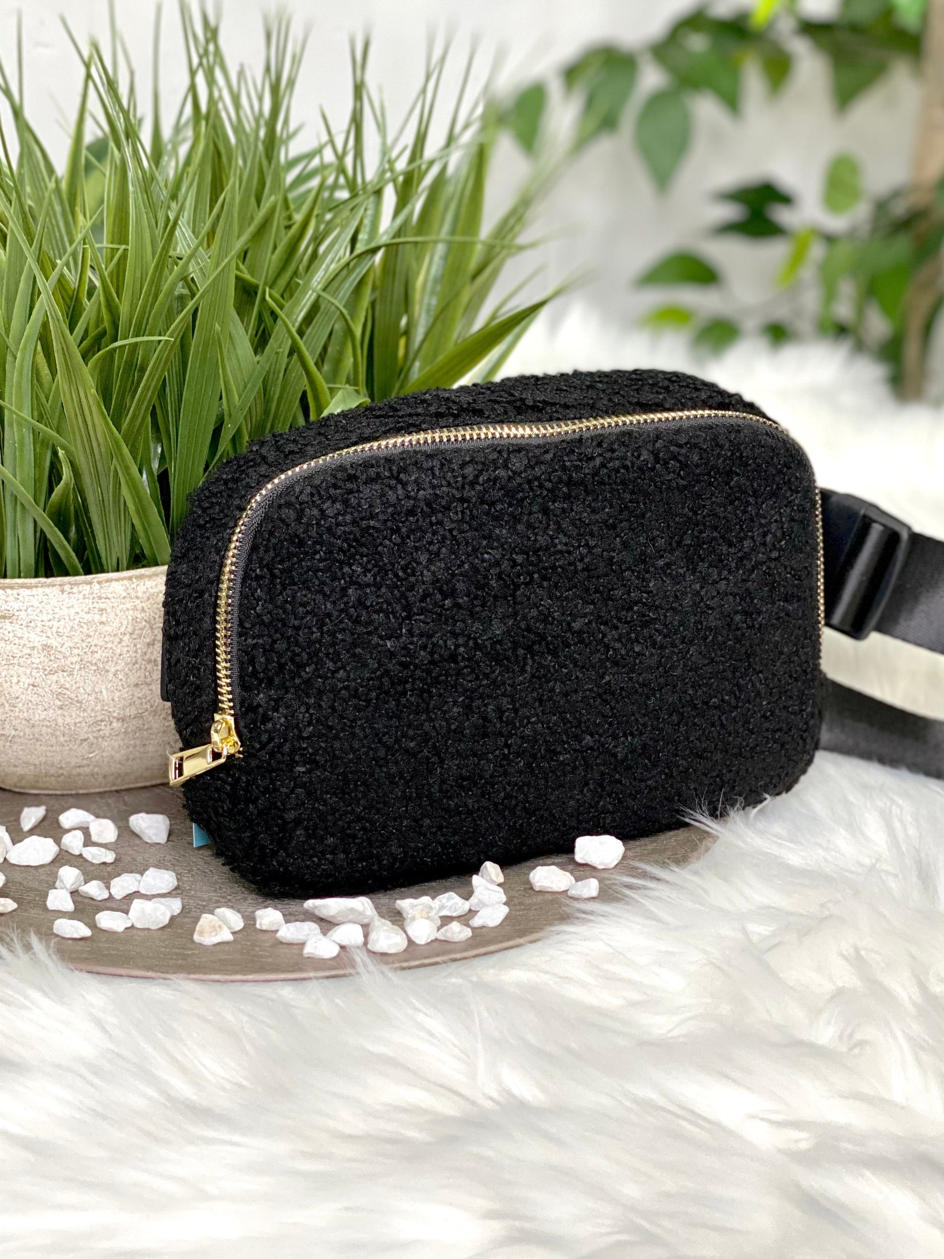 Brand new item! Waist packs are all the rage! These bags are perfect for everyday and so stylish. Made of a durable sherpa material and accented with gold zippers with an interior pocket. The waist belt is soft and adjustable.