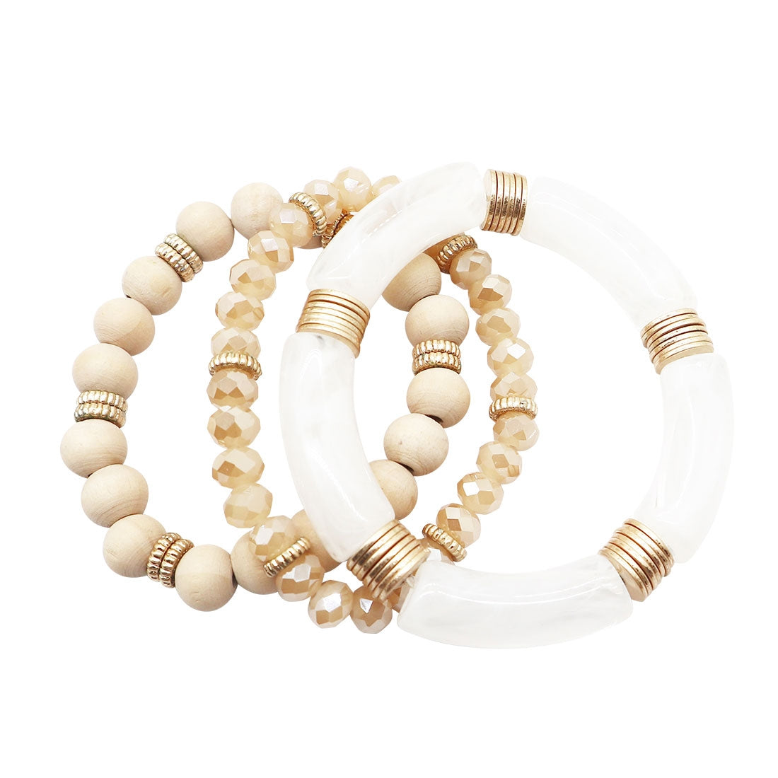 This bracelet stack will quickly become your go-to accessory, it features an eclectic mix of thin and chunky beaded bracelets with metallic accents that will perfectly pair with your favorite outfits.