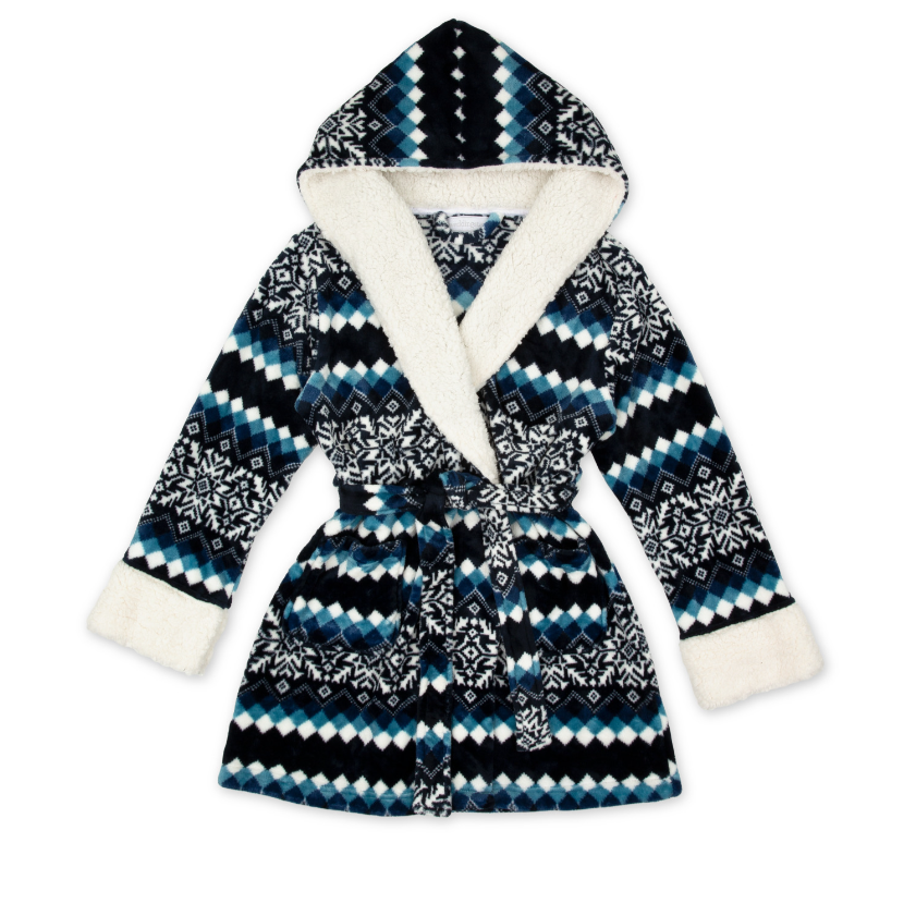 Soft and comfy, the plush bathrobe is perfect for lounging. With a white Sherpa lined hood, roomy Sherpa lined sleeve cuffs, and pockets, the super-soft fuzzy Nordic snowflake dressing gown will keep you warm and cozy around the house, enjoying your morning coffee, or after you’ve slipped out of the spa tub. Ideal for the colder winter months. The blue snowflake patterned polyester robe isn’t too long, reaching knee-length, so it’s a super cute style too. You’ll feel comfortable slipping it on in front of house guests. Give the fluffy house coat to your bridesmaids as a bridal party favor, a Mother’s Day gift, or a present during the holidays.